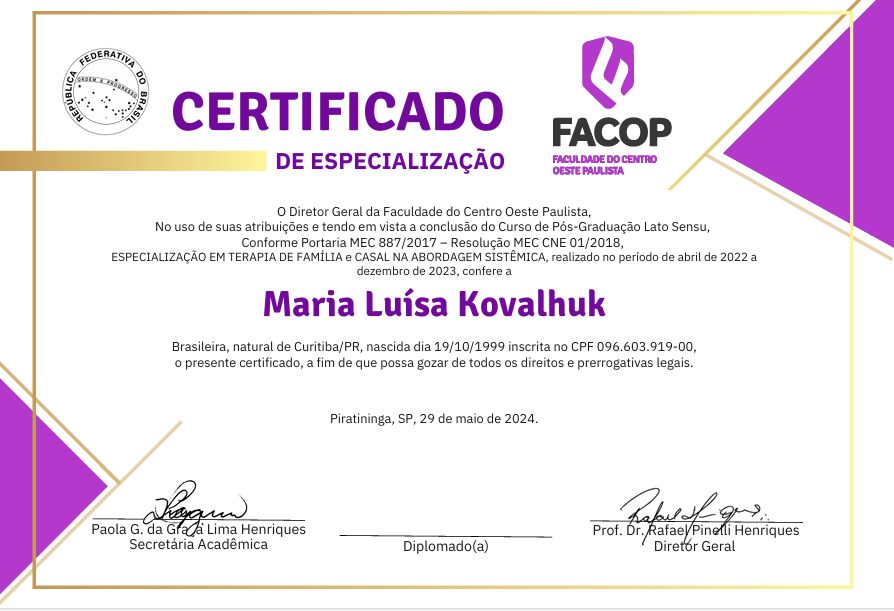 - Pós graduada em Psicologia Familiar Sistêmica pelo IAC